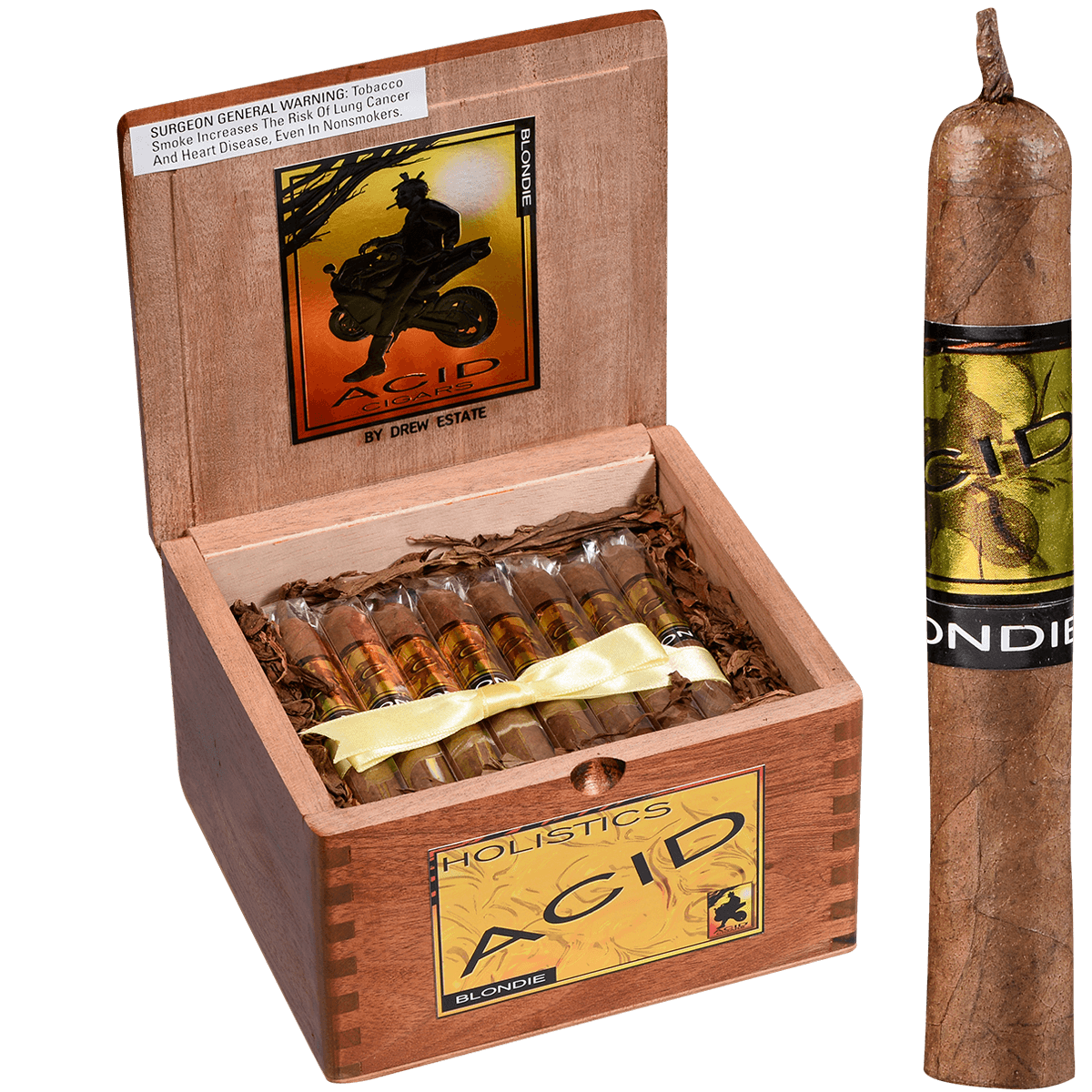 Acid Blue Blondie natural cigars have outstanding aged Nicaraguan Cuban-seed filler tobaccos and are cured in cuarto aromaticos (aroma rooms) that are lined with over 150 natural botanicals, essential oils, herbs & spices.